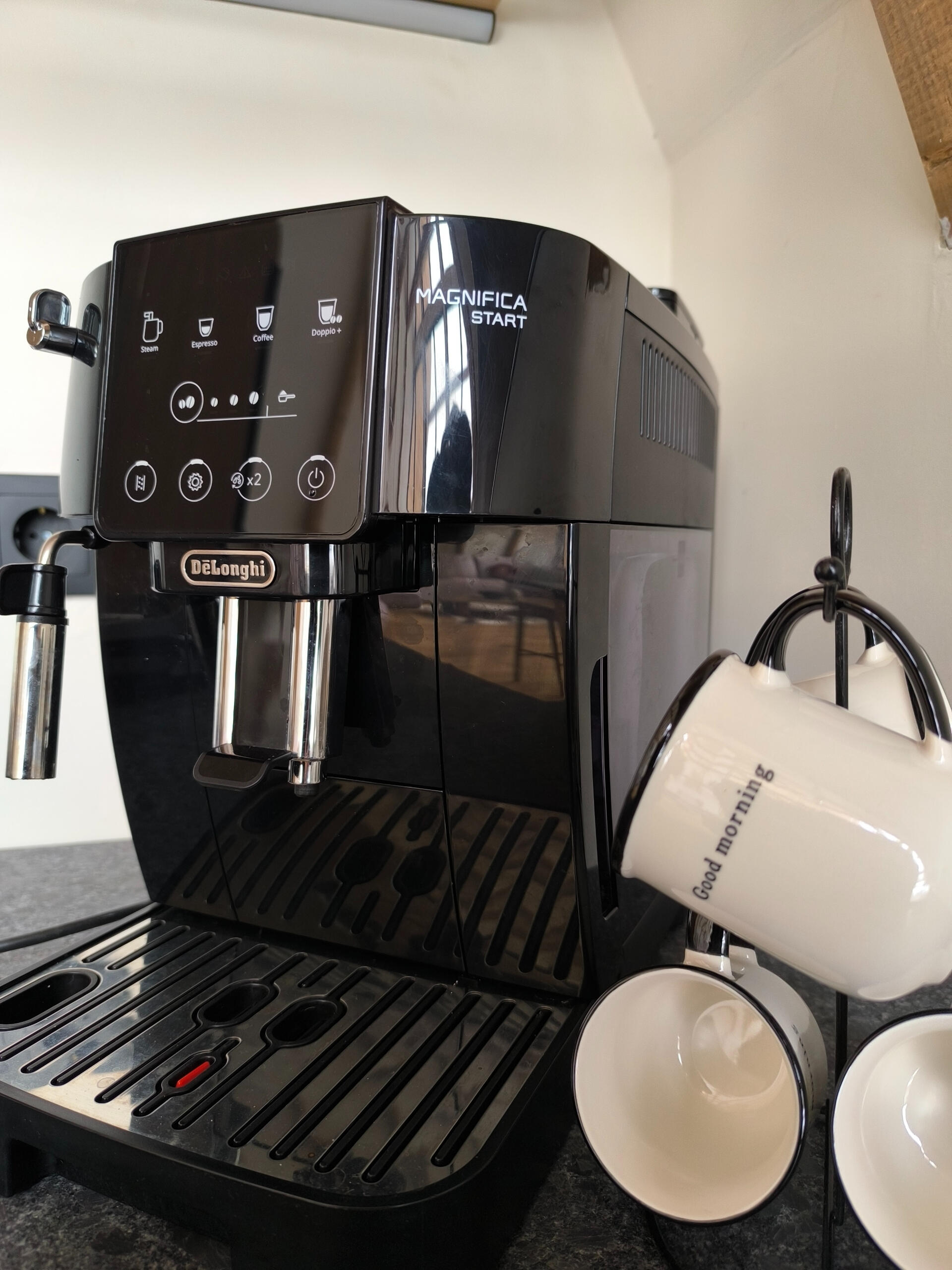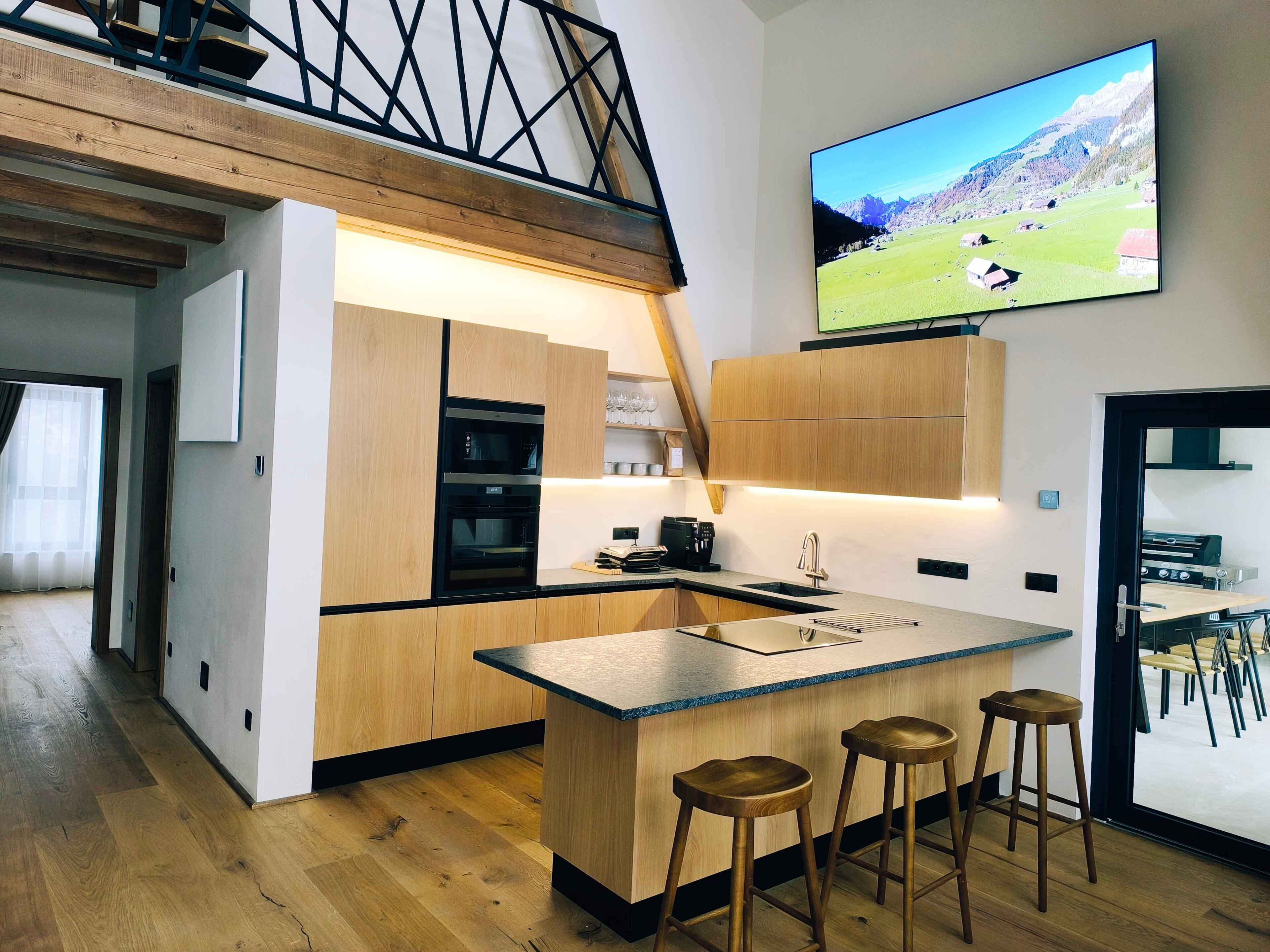 Voll ausgestattete Küche (Backofen, Induktionskochfeld, Geschirrspüler, Kaffeemaschine mit Bohnen, Essbereich)